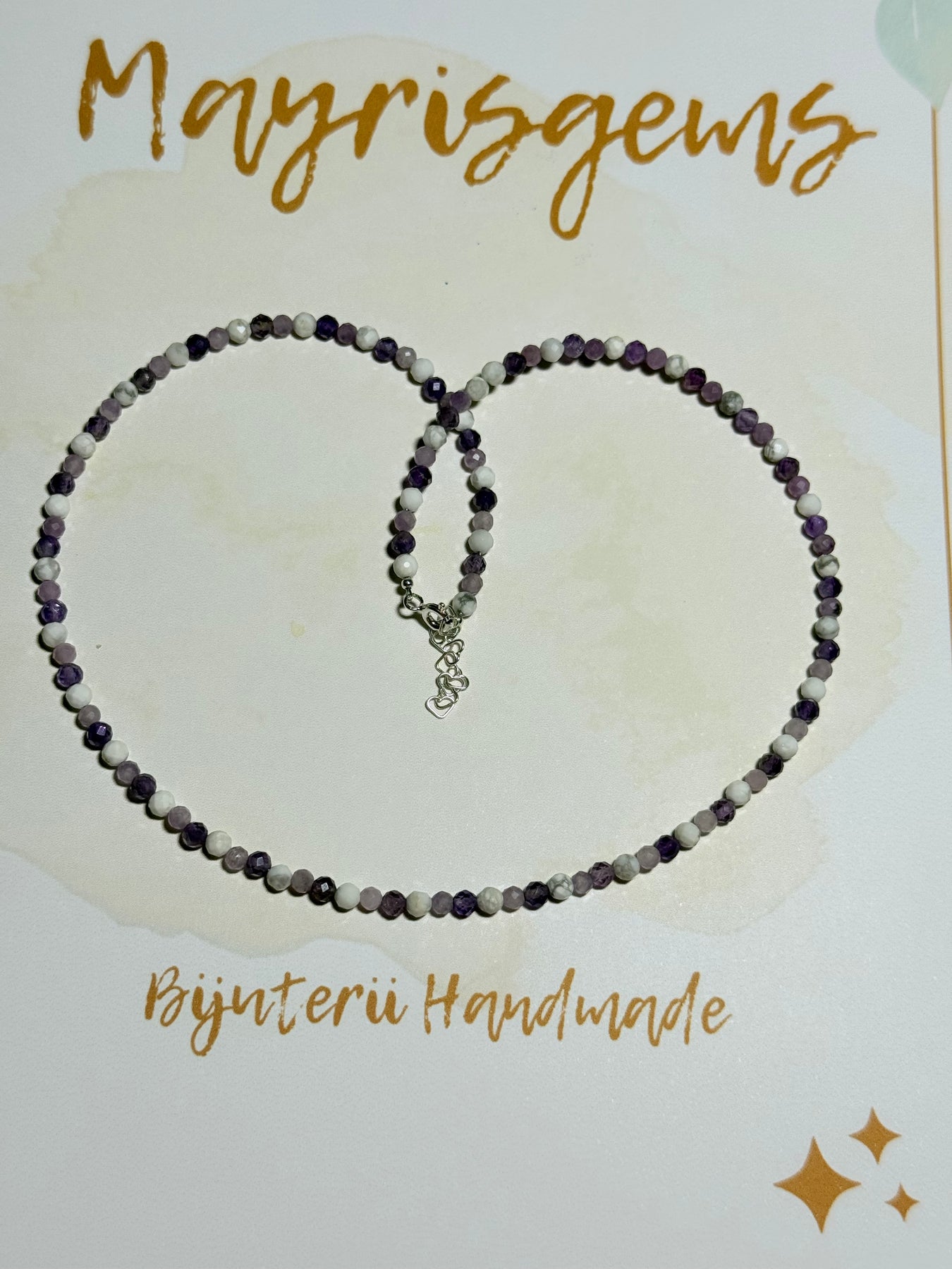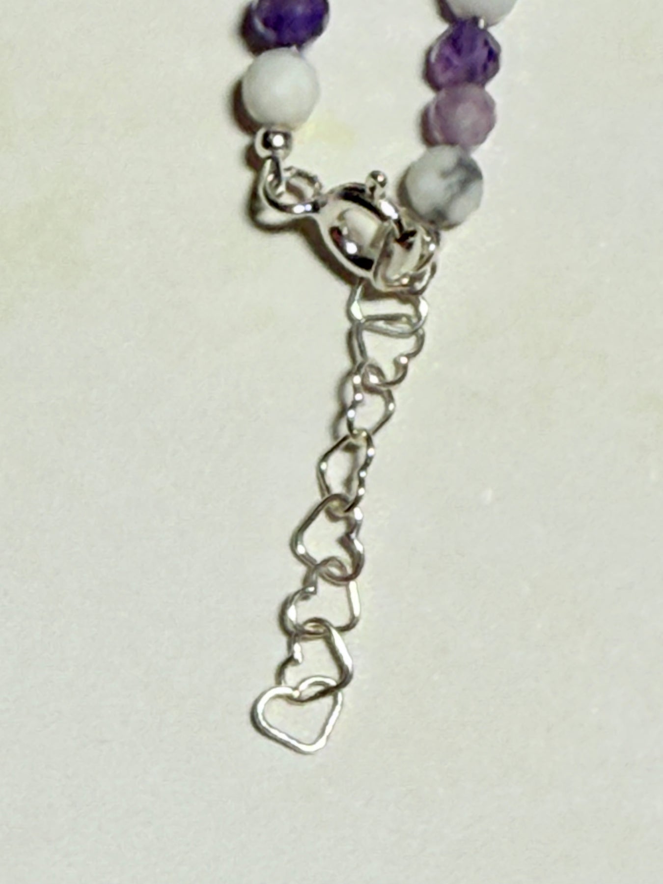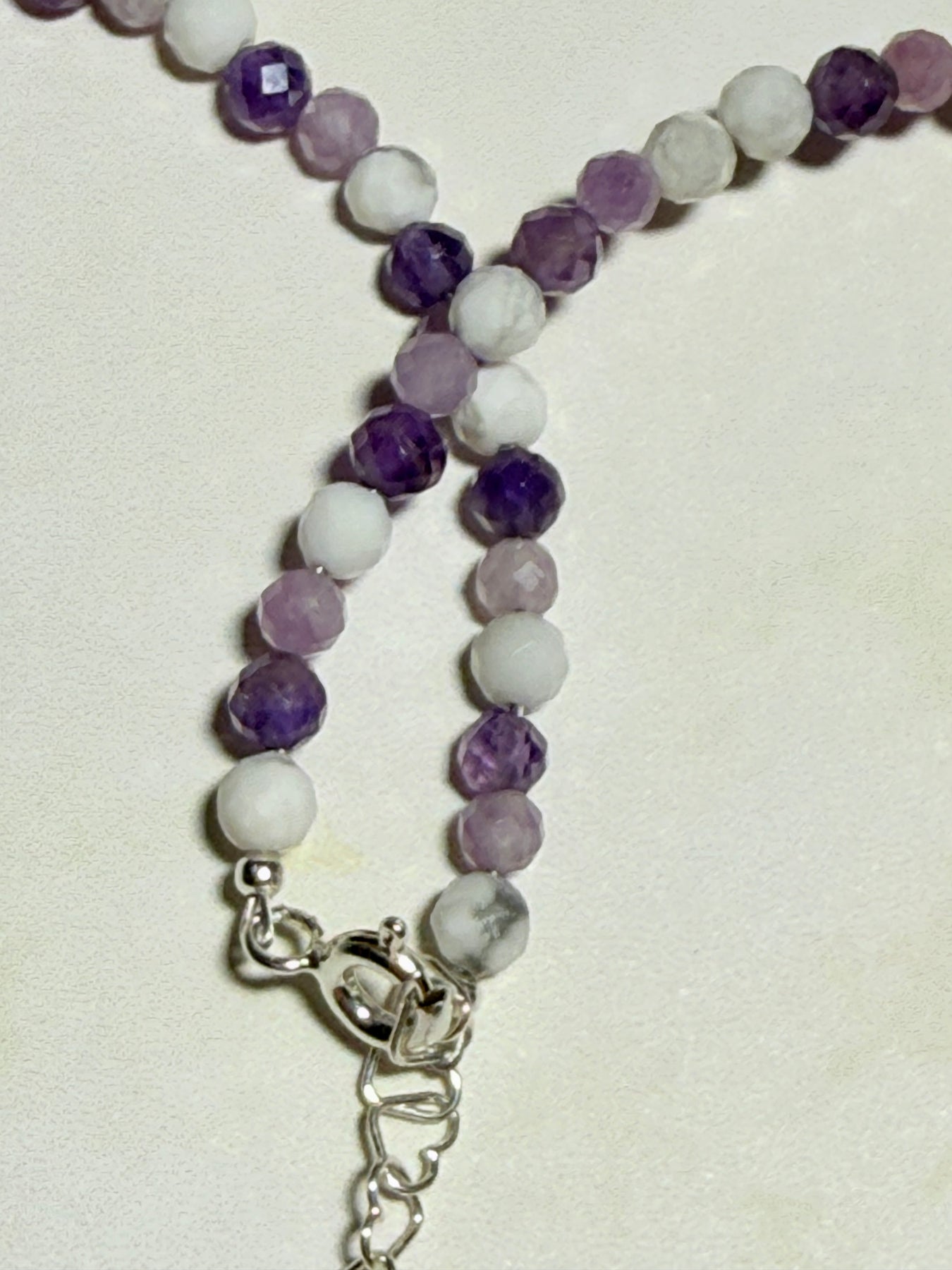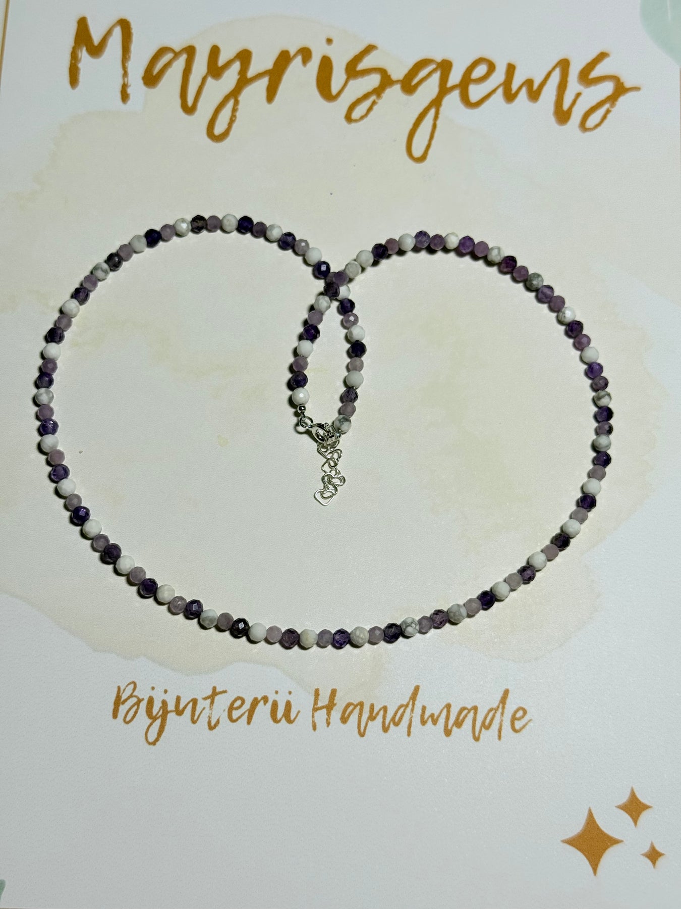 Un colier delicat, dar profund vindecător, creat manual din Howlit, Lepidolit și Ametist, cu mărgele fine de 3-4 mm și accesorii din argint 925. O bijuterie cu energie blândă și echilibrată, ideală pentru femeile care își doresc mai multă liniște interioară, protecție emoțională și armonie mentală.