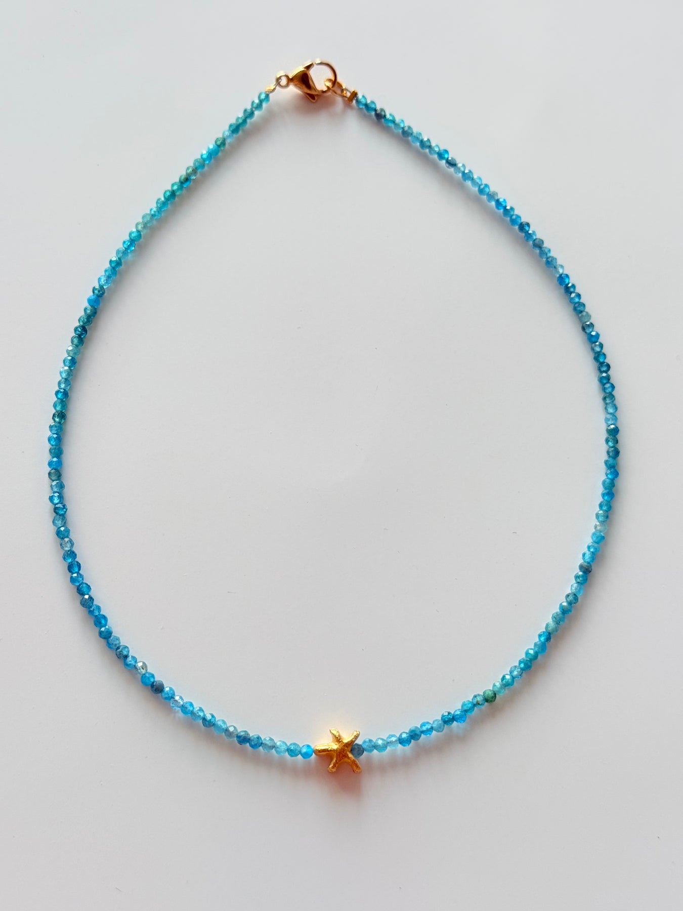 Colierul Mayris GEMS este realizat manual din Apatit natural fațetat de 2,5 mm, având ca element central un pandantiv Stea de Mare din argint suflat cu aur, simbol al regenerării, speranței și ghidării interioare. Un colier delicat și plin de semnificație, ideal pentru femeile care doresc să se exprime cu autenticitate, să se reconecteze cu vocea lor interioară și să atragă comunicare armonioasă în viața lor.