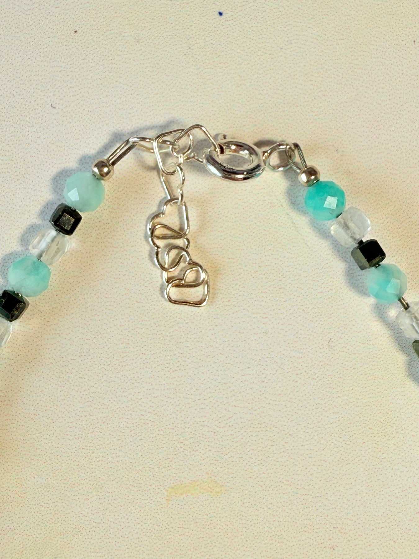 - Cristale: Pirita, Clear Quartz, Amazonit – fațetate și rotunde, 2–3 mm